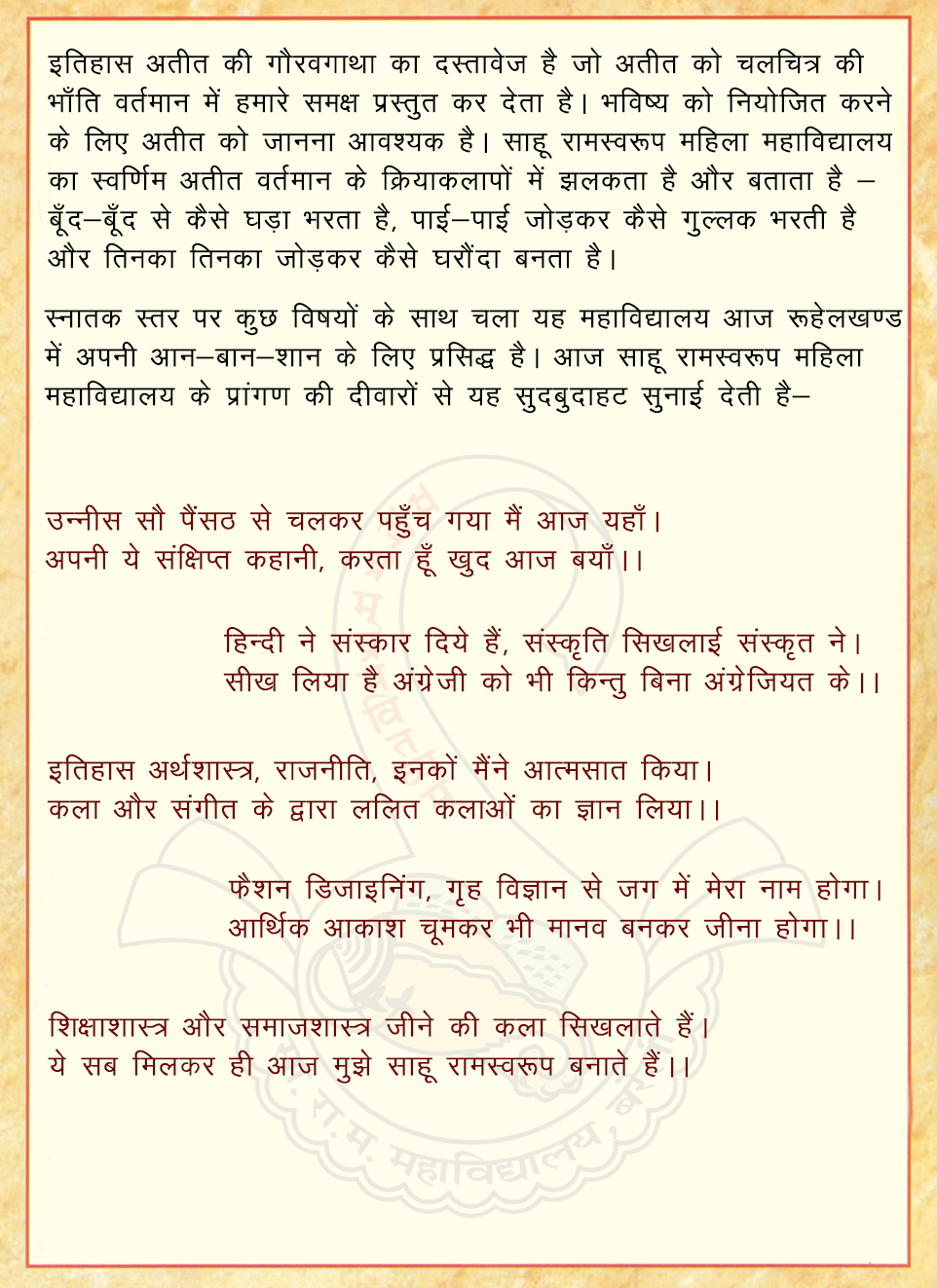 As per the decision of the Sahu Ram Swaroop Dharmarth trust, the degree college was renamed after its founder, Sahu Ram Swaroop ji. Thus, the graduate and the post graduate section was legally named "Sahu Ram Swaroop Mahila Mahavidyalaya".