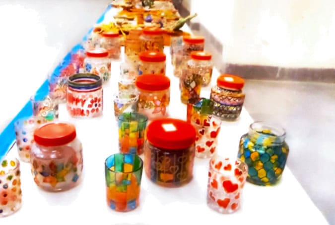The department discussed and then selected ‘Deeputsava’ as the focus of the session. The aim was to teach students about natural and artificial lighting. The students prepared decorative deeyas, hanging lamps, candles and lanterns. Bottles with tee lights were also decorated. Many students made electric lamps and lanterns. They further decorated the lamp shades, using various painting and printing techniques. A few students even embroidered the lamp shade cloth.