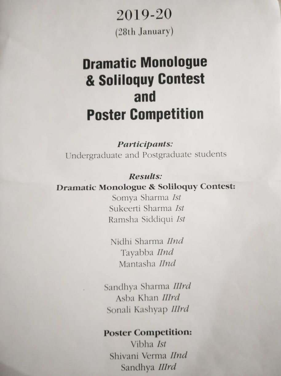 Literary Activities - The English Literary Association regularly organises literary activities. From time to time our students have enacted Macbeth, Julius Caesar, Monkey's Paw, Porphyria's Lover, Pygmalion, Like the Sun, The Merchant of Venice, Candida, While the Auto Waits, on the college stage and won accolades. Dramatic monologue and soliloquy performance, essay writing, quiz competition, debate competition, poetry recitation, poster making, are regularly organised to bring the latent talents of the students to the fore. Furthermore, their writing skills are given a platform in the English section of the college magazine , Gyananjali.