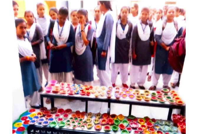 The department discussed and then selected ‘Deeputsava’ as the focus of the session. The aim was to teach students about natural and artificial lighting. The students prepared decorative deeyas, hanging lamps, candles and lanterns. Bottles with tee lights were also decorated. Many students made electric lamps and lanterns. They further decorated the lamp shades, using various painting and printing techniques. A few students even embroidered the lamp shade cloth.